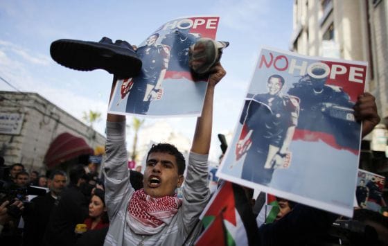La histórica visita a Palestina no fue del todo agradable para el presidente de Estados Unidos, ya que cientos de palestinos expresaron su rechazo agitando un zapato en sus manos, uno de los mayores insultos que puede infligir un árabe.