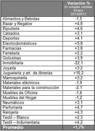 Las siguientes fueron las principales variaciones en los volúmenes físicos vendidos en enero de 2013 según la CAME frente a igual fecha de 2012, relevadas en 737 comercios del país:
