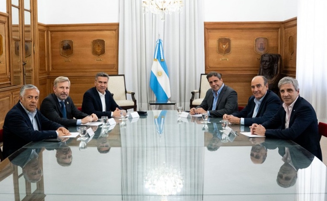 En el Salón de los Escudos, el jefe de Gabinete, Guillermo Francos, y los ministros del Interior, Lisandro Catalán, y de Economía, Luis “Toto” Caputo, se reunieron con los tres gobernadores socios electorales de La Libertad Avanza: los radicales con peluca Cornejo y Leandro Zdero (Chaco) y el macrista Rogelio Frigerio (Entre Ríos).