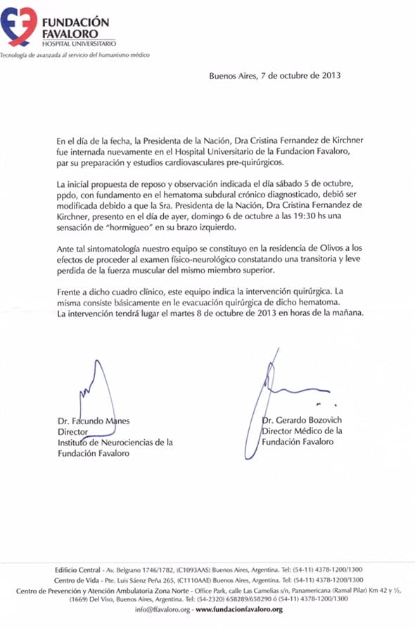 "La Sra. Presidenta de la Nación, Dra. Cristina Fernández de Kirchner, sufrió el día 12 de agosto de este año un traumatismo de cráneo, por el cual se le realizó una tomografía computada de cerebro en el sanatorio Otamendi, resultando la misma normal. Posteriormente, la Sra. Presidenta no presentó síntomas. Una vez realizados los estudios de control correspondientes en dicho instituto, se arribó al diagnóstico de colección subdural crónica. Debido al mencionado diagnóstico se indicó reposo de un mes, junto a seguimiento evolutivo estricto clínico e imagenológico", informó Scoccimarro.