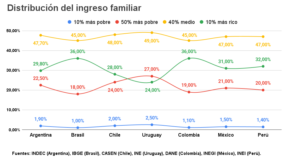 - El 50% más pobre argentino recibe 22,5%, lo que lo coloca por encima de Brasil y Colombia, pero por debajo de Uruguay.