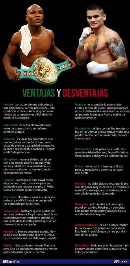 “Maidana es un rival muy difícil, siempre da lo mejor de sí, pega muy duro. Es un campeón como lo soy yo, debo esforzarme hasta el límite”, sostuvo “Money” (vaya apodo para un deportista) en conferencia de prensa tras elegir al Chino como rival. Lo cierto es que, tras vencer Saúl “Canelo” Álvarez, un mexicano 14 años menor que él, Floyd se quedó sin rivales de fuste, ya que el pelirrojo era lo de lo más duro que quedaba en el camino.
