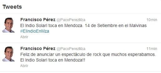 Pérez escribió textual en la red social del pajarito: "Feliz de anunciar un espectáculo de rock que muchos esperabamos. El Indio Solari toca en Mendoza!!". Y luego confirmó la fecha del evento más grande del rock argentino en la actualidad.