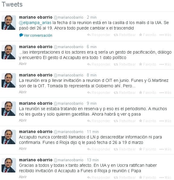Obarrio ensayó una defensa que desmiente la desmentida del papa. Dio a conocer las fuentes que le dieron la información sobre una invitación a los titulares de la UIA (Unión Industrial Argentina), la UOCRA (Unión Obrera de la Construcción) y el Ministerio de Trabajo: "En UIA y en Uocra ratifican haber recibido invitación", aseguró el redactor en su cuenta de Twitter, el domingo en la noche, luego de que se replicaran múltiples repercusiones por la desmentida que operó el líder mundial de la Iglesia Católica de Roma.