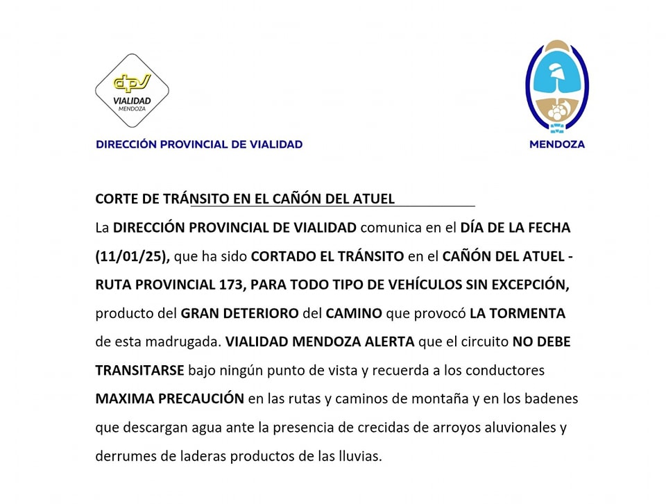 En consecuencia, se recomienda evitar la zona del Cañón del Atuel y seguir las instrucciones que se informen oportunamente mediantes las vías oficiales de comunicación.