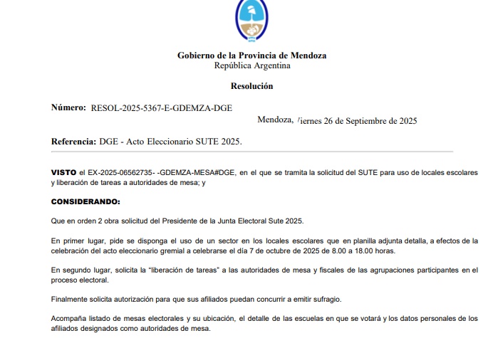 La resolución RS-2025-07704307-GDEMZA-DGE, enviada por la Junta Electoral del sindicato a las agrupaciones este martes, autoriza el uso de los edificios escolares para el acto eleccionario y concede liberación laboral únicamente a las autoridades de mesa designadas. No menciona a fiscales ni votantes, quienes deberán ejercer sus derechos fuera del horario laboral.