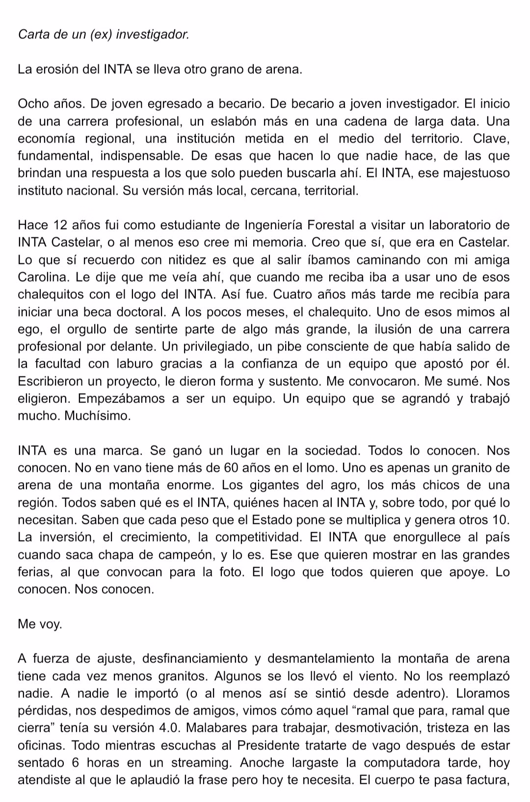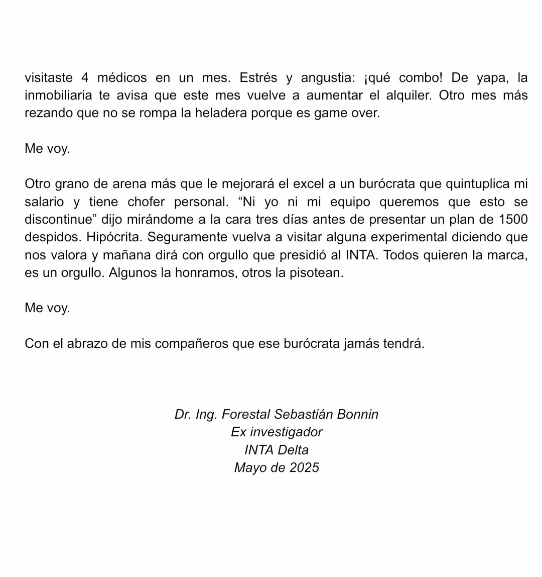 "Cuando era joven graduado, INTA me brindó la posibilidad de insertarme en la ciencia aplicada, con proyectos que tenían impacto real en las economías regionales", relata el autor de la misiva. En su testimonio, recuerda el entusiasmo de los primeros años, cuando los investigadores podían acceder a financiamiento y llevar adelante estudios que fortalecían a los productores locales.