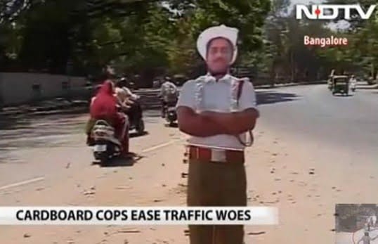 La Policía de la ciudad de Bangalore, en la India, puso en práctica un nuevo método para tratar de reducir las infracciones y accidentes en rutas: colocaron en algunos puntos maquetas de policías de cartón para que los automovilistas crean que están continuamente vigilados y extremen la prudencia.