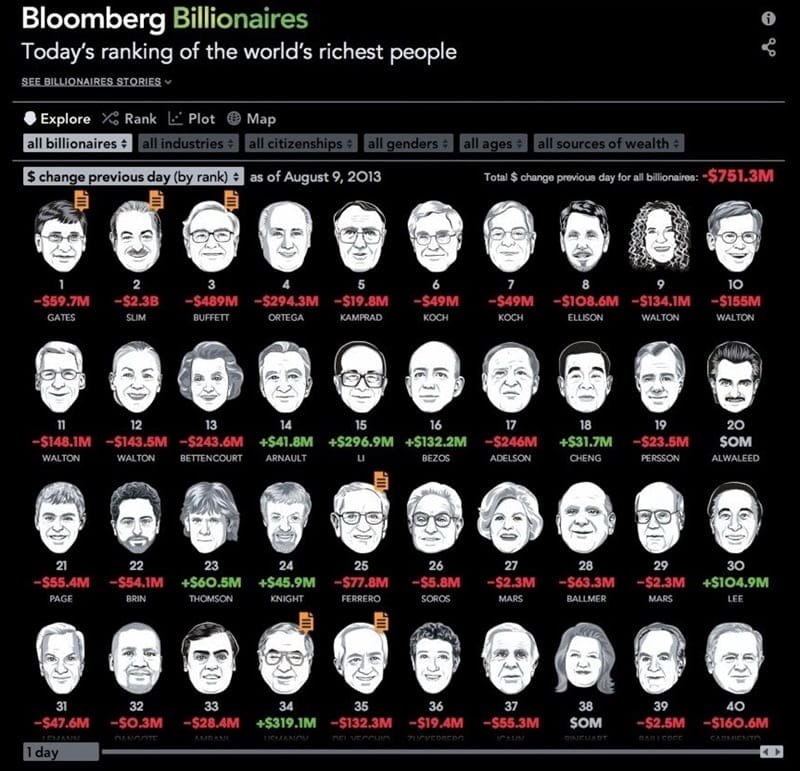 2013 ha sido un buen año para las mayores fortunas del planeta, según los datos hechos públicos por el portal Bloomberg, que calcula que las 300 mayores fortunas sumaron 524.000 millones de dólares (unos 383.000 millones de euros) más durante el año pasado.