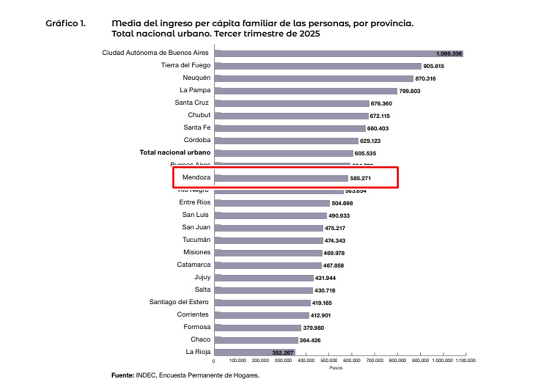 El reciente informe de la Encuesta Permanente de Hogares (EPH) del INDEC, correspondiente al tercer trimestre de 2025, dejó a Mendoza fuera del top 10 de provincias con mayores ingresos per cápita familiares. Con un promedio de $585.271, la provincia se ubica por debajo del promedio urbano nacional de $605.535. Se trata de un dato del ingreso medio de quienes trabajan en blanco o en negro y declaran algún tipo de ingreso, que en el total nacional arrojó $914.274.