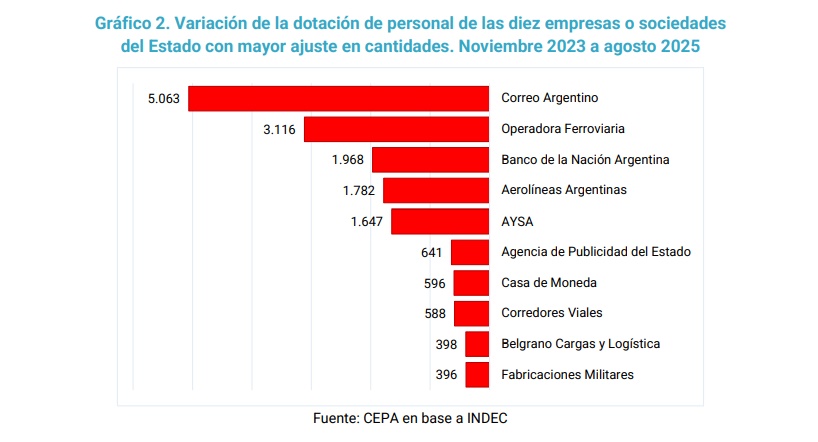 "Desde noviembre de 2023, el recorte de personal en el sector público ha sido profundo, con un fuerte impacto en empresas y organismos estratégicos del Estado. El caso más significativo es el del Correo Argentino, que encabeza el listado con 5.063 despidos. Esta situación no solo implica una pérdida laboral masiva, sino que afecta funciones esenciales que exceden el envío de cartas y paquetes: el Correo garantiza la conectividad territorial, presta servicios en zonas desatendidas por operadores privados y cumple un rol logístico clave para el Estado, incluyendo la distribución de DNI, medicamentos, materiales educativos y el soporte de los procesos electorales del país", indica CEPA.