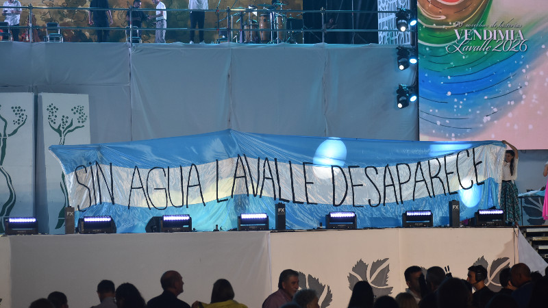 La Vendimia volvió a convertirse en escenario de disputa política y ambiental. Esta vez fue Lavalle el epicentro de un gesto inesperado: al cierre del espectáculo artístico, un grupo de artistas desplegó una extensa bandera con la consigna “Sin agua Lavalle desaparece”. El mensaje, encendido en plena celebración, resonó entre miles de espectadores y transformó el escenario en tribuna de reclamo social. La defensa del agua, recurso vital para la vida y la producción local, irrumpió en la fiesta con la fuerza de una consigna histórica del departamento.
