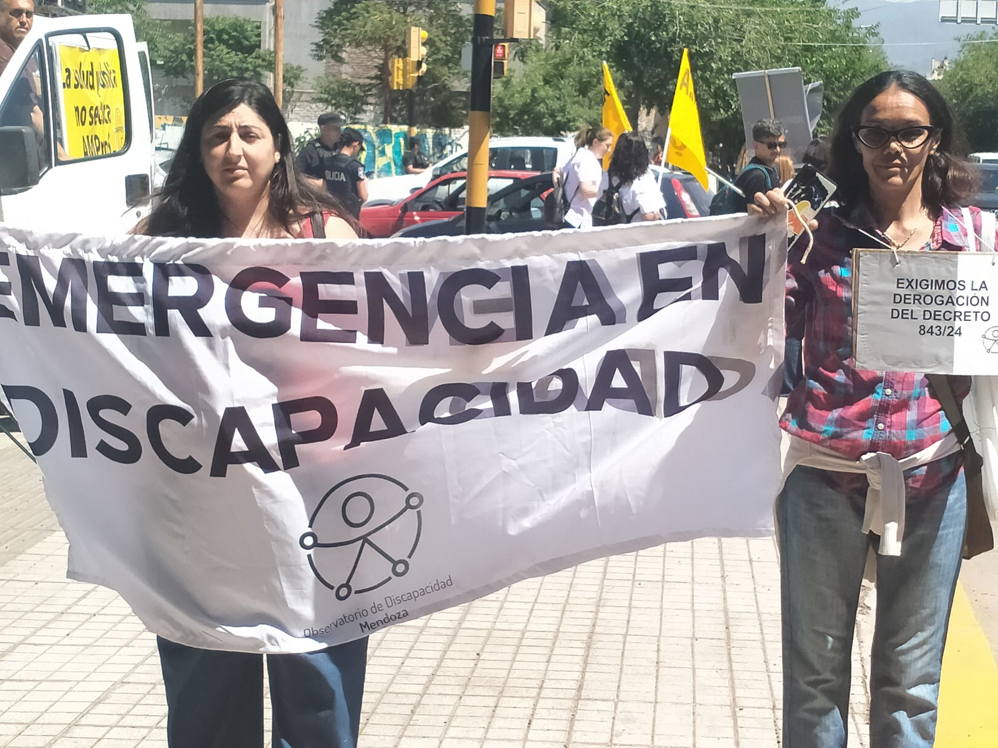Banderas de AMPROS, UPCN, ATE, FADIUNC, Judiciales y el Observatorio de la Discapacidad Mendoza flamearon junto a pancartas que denunciaban el vaciamiento de universidades, hospitales y programas de discapacidad. La protesta articuló demandas salariales, exigencias legislativas y defensa de derechos gremiales en un contexto de ajuste nacional y tensión territorial.