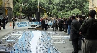 La “instalación” consistió en el despliegue de telas celestes y blancas que unidas formaban la bandera argentina y sobre las cuales colocaron botellas que adentro llevan los rostros de “los 323 héroes caídos” y fue realizada por Alejandra Siri, hermana de uno de los soldados muertos en el ataque.