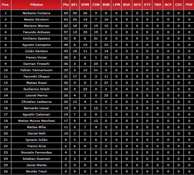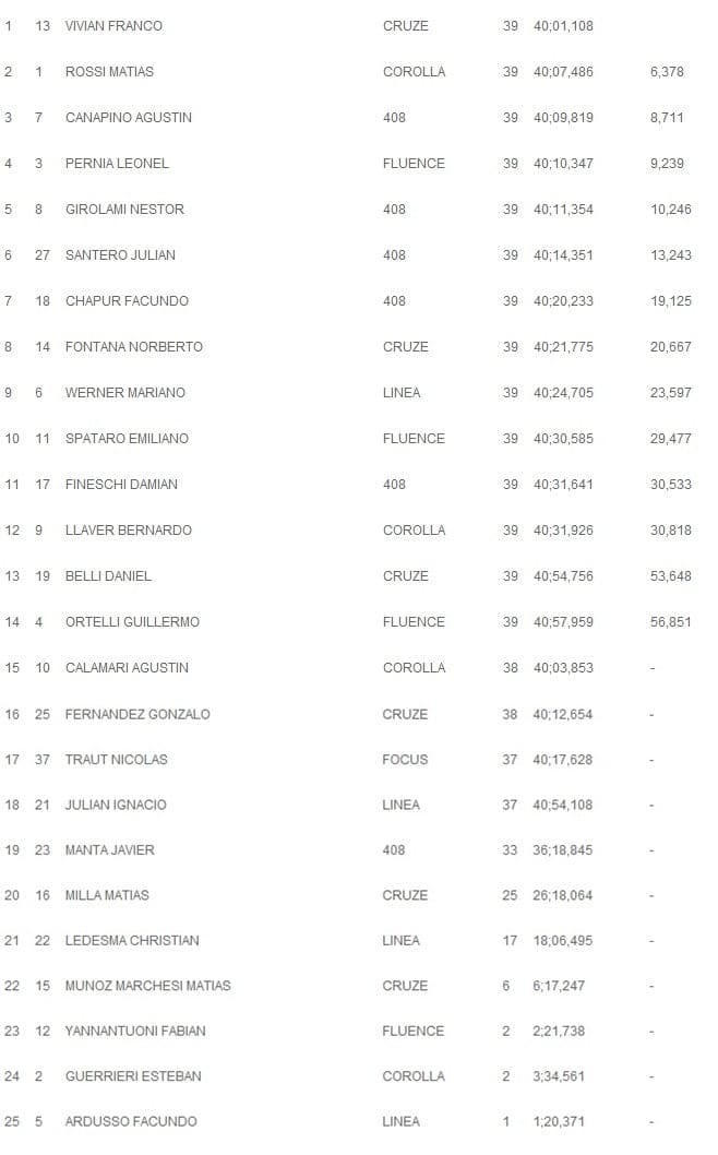 Luego del repetido cuarteto de punta, el quinto lugar que tenía Julián Santero se lo cedió a su coequipier de Peugeot Néstor Girolami y de esta forma, "Bebu" sumó algunos puntos más para ser el nuevo perseguidor de Fontana al tope del campeonato, el arrecifeño finalizó octavo.