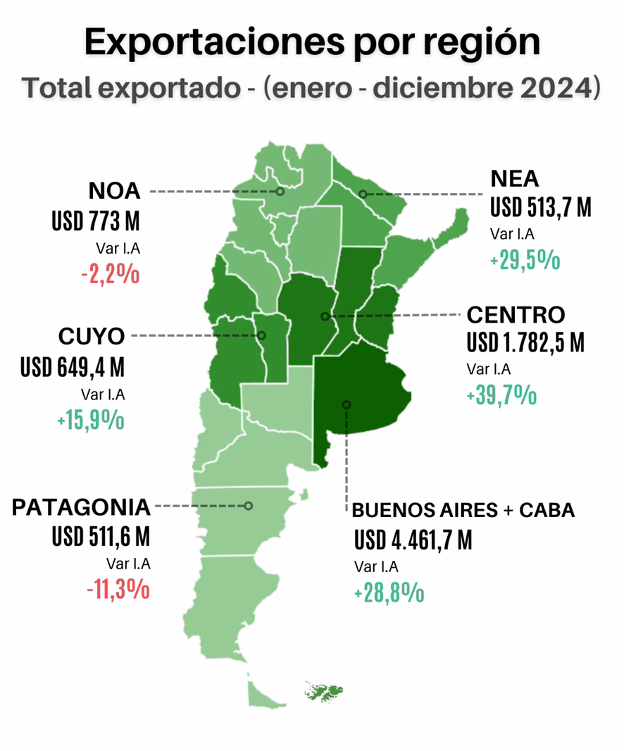 A nivel regional, Buenos Aires y CABA lideraron las exportaciones, representando el 50,9% del total nacional, con ingresos por USD 4.461,7 millones, un 28,8% más que en 2023. El complejo ganadero fue el más representativo en esta región, con ventas por USD 425,5 millones.