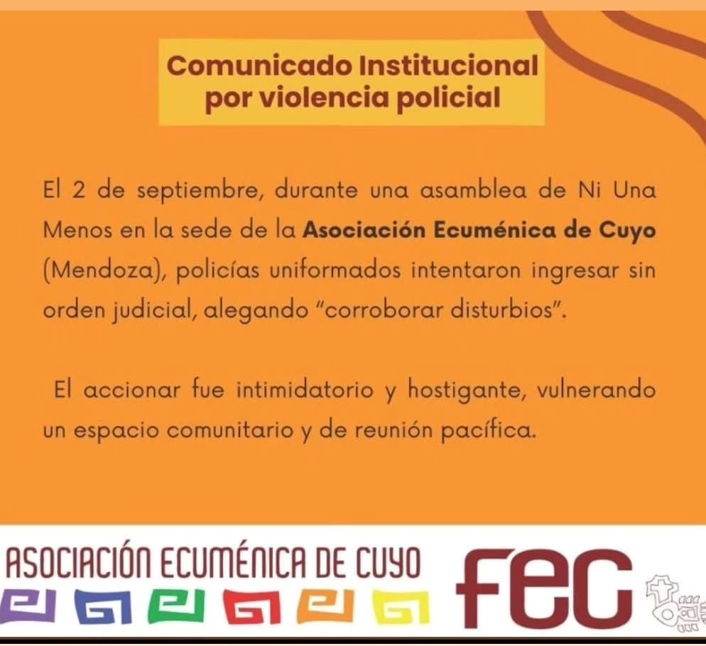 La tarde del lunes 2 de septiembre, efectivos de la Policía de Mendoza irrumpieron sin orden judicial en la asamblea mensual del colectivo feminista Ni Una Menos, realizada en la sede de la Fundación Ecuménica de Cuyo. El ingreso de los uniformados, que exigieron datos personales de las asistentes, fue denunciado como un acto de hostigamiento institucional y vulneración de derechos constitucionales.