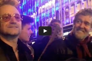 Bono, el vocalista de U2 cantó villancicos en la ciudad irlandesa de Dublin junto al líder de la banda irlandesa The Frames y sorprendió a los transeúntes en Navidad.