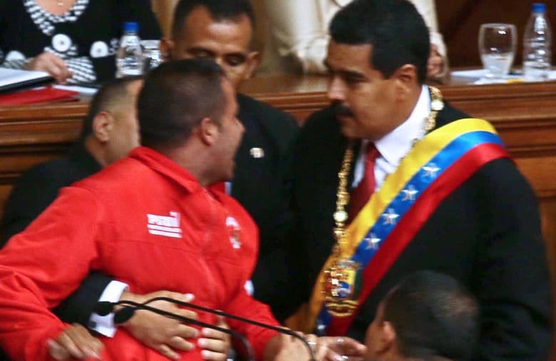 El desconocido subió a la tarima desde la escalera del lado izquierdo. Llevaba una chaqueta roja, propia del chavismo, y pantalones tono beige. En la transmisión de televisión se pudo observar como el Presidente de la AN, Diosdado Cabello, intenta detener al hombre, que lo que esquiva e incluso llega a confrontar brevemente con Maduro.