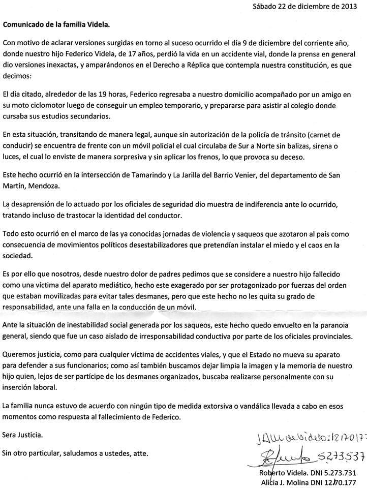 Los familiares de Federico Videla relataron que el joven estaba muy lejos de ser parte de actos de ese tipo, incluso al momento de ser atropellado regresaba a su casa luego de haber conseguido un trabajo temporario. Después de ser embestido, estuvo más de 50 minutos en la calle esperando una ambulancia.
