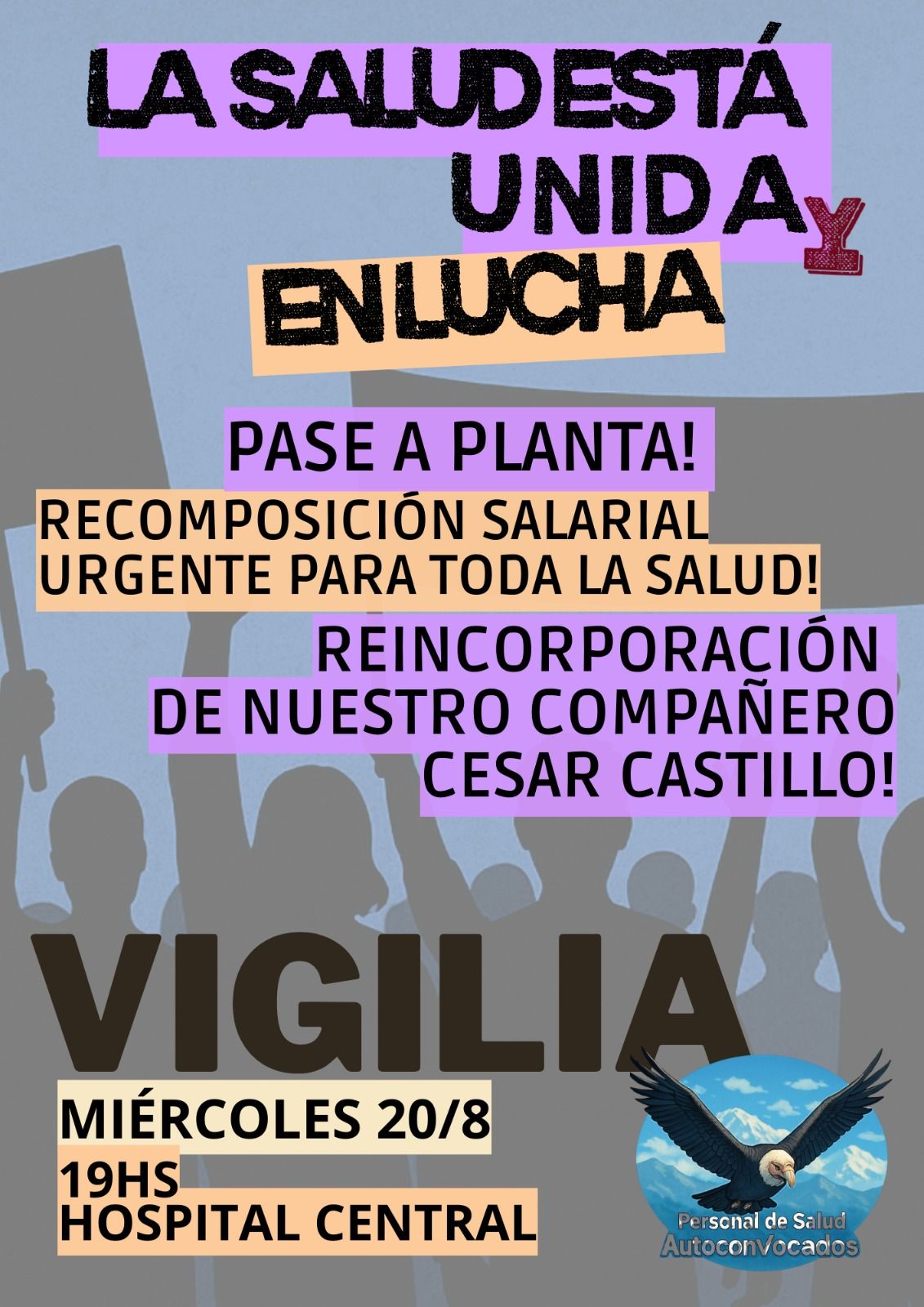 Este miércoles a las 19, trabajadores de la salud realizarán una vigilia frente al Hospital Central en reclamo por la reincorporación de César Castillo, referente de hemodiálisis despedido tras participar de una protesta por salarios precarizados. La convocatoria también exige condiciones laborales dignas para los más de 2 mil prestadores que facturan como monotributistas en Mendoza.