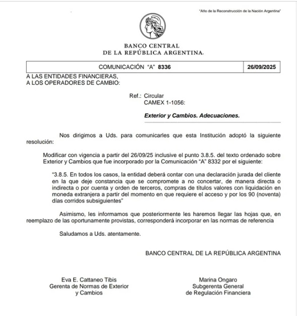 La semana pasada se había aplicado la misma restricción a personas vinculadas a entidades financieras; con la nueva norma, quienes operen en el mercado libre de cambios no podrán operar en el mercado de bonos, al contado con liquidación (CCL) o MEP, y viceversa.